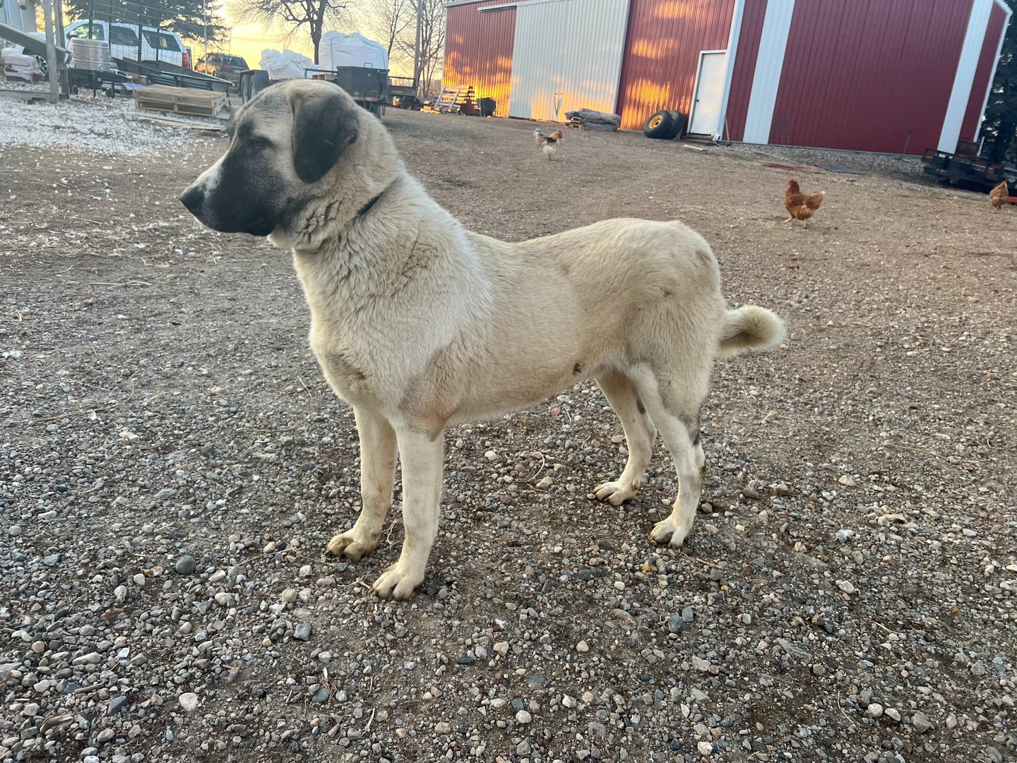 Maggie has proven herself to be content to guard chickens and poultry of all sizes, sheep, calves, and goats. She has shown exceptional agility and patience around the larger cows who try to push her around. She tends to give them a wider berth when they're in an ornery mood.