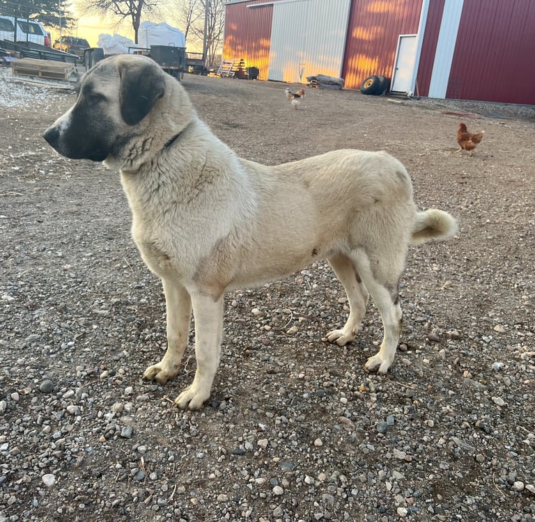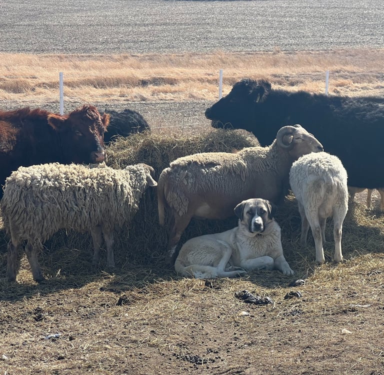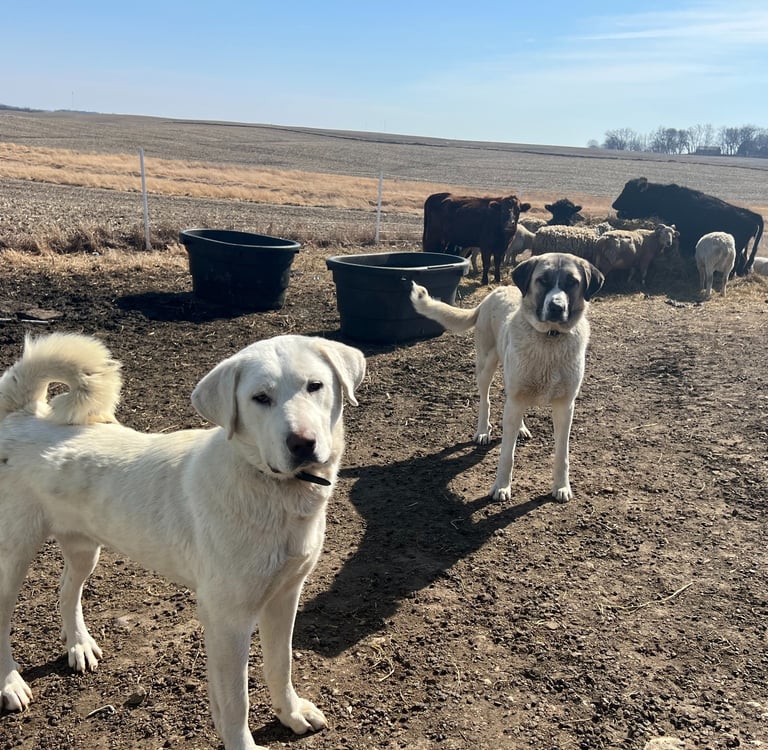 We breed and train Guardian Angaloz dogs (pronounced ONG-gal-oz) to protect livestock with calm confidence and steadfast vigilance. These dogs ensure safety around the clock, standing guard against predators day and night.